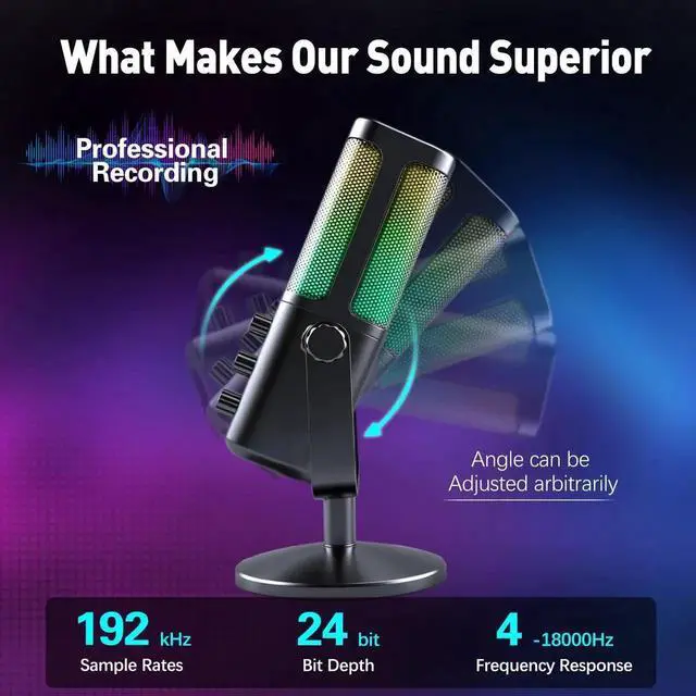 Cardioid Polar PatternThe RGB gaming mic features a cardioid polar pattern and boasts a high sampling rate of 192kHz/24Bit, enabling it to accurately capture crisp, smooth, clear sound from the front of the microphone, effectively reducing interference from side and background noise to ensure your voice is clear and detailed. Whether you're gaming or live streaming, you and your friends or audience can communicate seamlessly