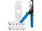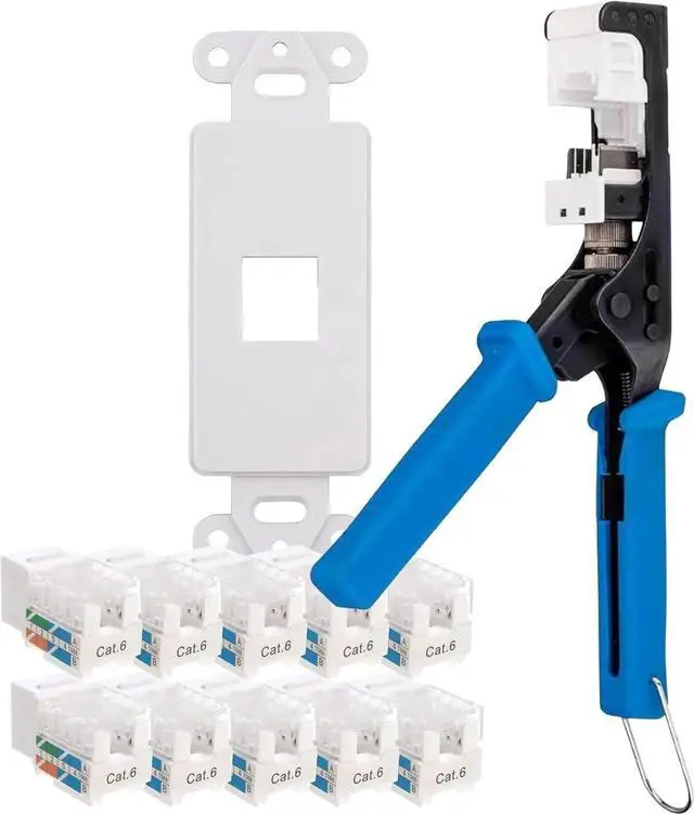 Complete Installation Kit - Includes 10 Cat6 45° white RJ45 keystone jacks, 10 single-port keystone inserts, and 1 termination tool for angled keystone jacks.
