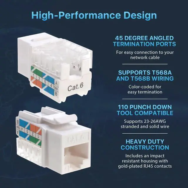 High-Performance Cat6 Jacks - Rated for up to 10Gbps and 250MHz, these slim profile jacks deliver reliable network connectivity for home and office.