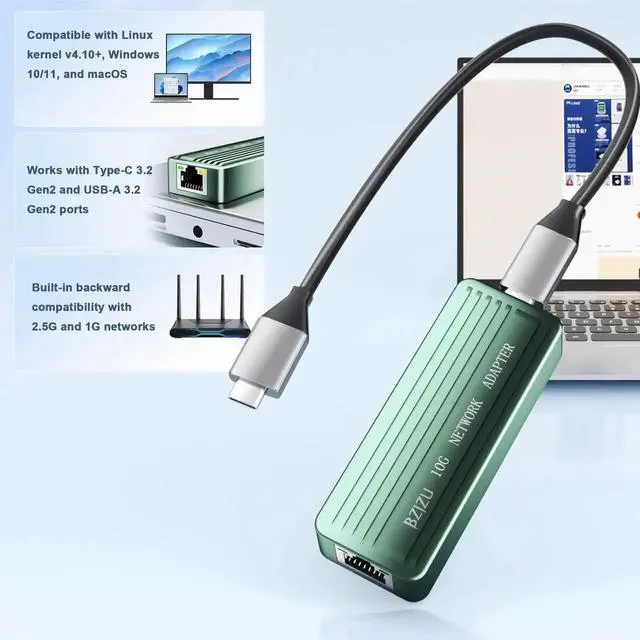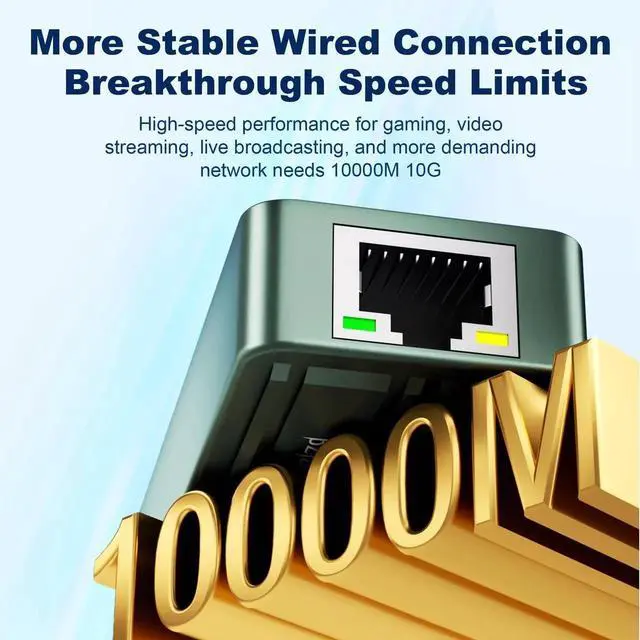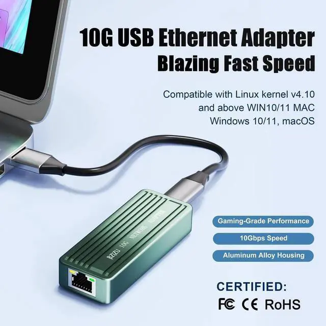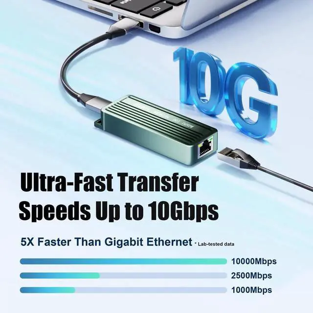 MUST READ: To unlock 10GbE speed on Windows, you must install thedriver. Without the driver, speed is limited to 100Mbps. ^^ REQUIRES USB 3.2 GEN 2x2 Achieves true 10Gbps only on USB 3.2 Gen 2x2 (20Gbps) or Thunderbolt 3/4 ports. Connecting to standard USB 3.0 / 3.1 ports will cap speeds at 5Gbps. ^^ PREMIUM ALUMINUM HOUSING The durable aluminum alloy shell acts as a heatsink. It actively dissipates heat to maintain stability during heavy data transmission and extends the device's lifespan. ^^ 5-SPEED AUTO-NEGOTIATION Automatically adapts to your network: 10G, 5G, 2.5G, 1G, or 100Mbps. Requires Cat6a or Cat7 cables for optimal 10GbE performance.