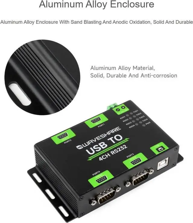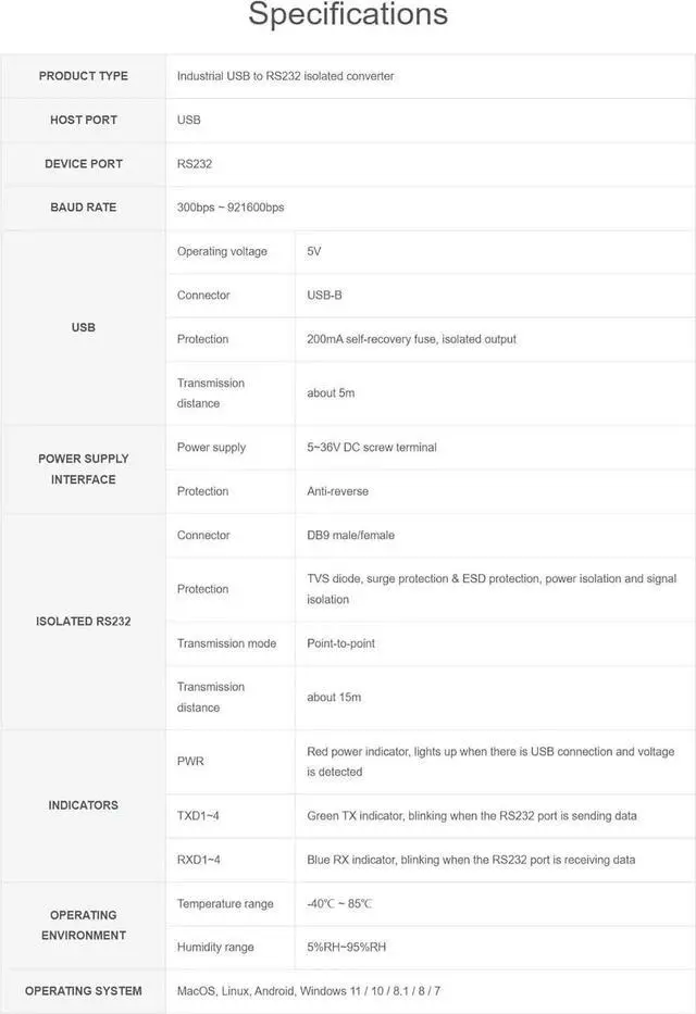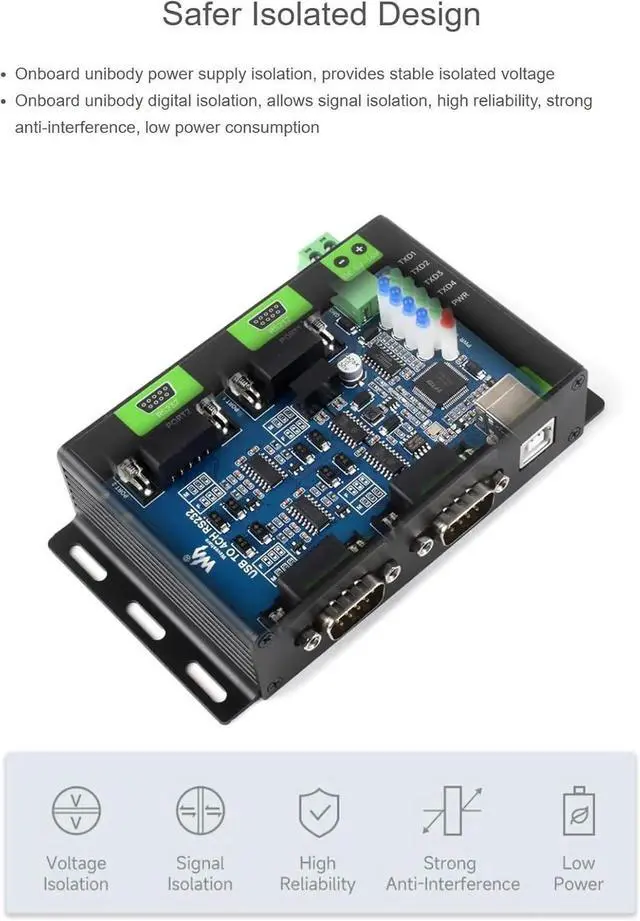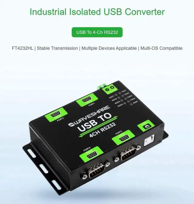 Supports USB to 4-ch isolated RS232, convenient for expanding multiple RS232 industrial serial devices