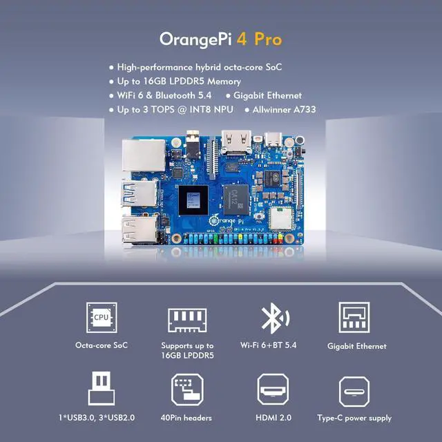 Orange Pi 4 Pro 4GB/6GB/8GB/12GB LPDDR5 Allwinner A733 8-Core Single Board Computer with 3 Tops NPU, WiFi 6/Bluetooth 5.4,Development Board with eMMC Socket Run Ubuntu/Debian/Android (4GB)