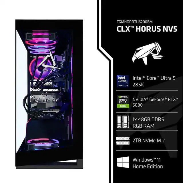 A true gaming warrior that sets the bar for high-performance gaming PCs-meet "The Falcon of War", the CLX HORUS Gaming PC built to overcome any challenge. Housed in a striking black mid-tower NV5 chassis, this AI-Accelerated CLX Horus is packed with premium components worthy of a gaming God. At the heart of this powerhouse is the Intel Core Ultra 9 285K processor, featuring 24 cores, 24 threads, and Intel AI Boost NPU (Neural Processing Unit) for next-level gaming, supercharged AI-enhanced content creation, and productivity. With a base clock of 3.7GH z and a max boost clock of 5.7GH z, you'll have the raw power to dominate AAA games, VR experiences, and creative workloads.