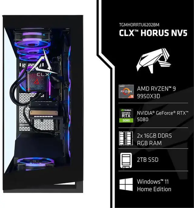 Unleash Unstoppable Gaming Power... Introducing the CLX HORUS TGMHORRTU6202BM, the AI-accelerated ultra-premium gaming PC built to dominate every game and creative challenge. Hand-built in the USA, this powerhouse sits in a stunning NV5 mid-tower chassis with near-seamless tempered glass and integrated Digital-RGB lighting, showcasing its premium components while keeping the system cool with multiple RGB fans and optimized airflow. At the core of this beast is the MSI MPG X870E Carbon WIFI motherboard, paired with the AMD Ryzen 9 9950X3D processor. With 16 cores, 32 threads, 2nd Gen 3D V-Cache technology, and Zen 5 multi-chip architecture, it delivers a base clock of 4.3GH z and turbo boost up to 5.7GH z.