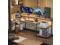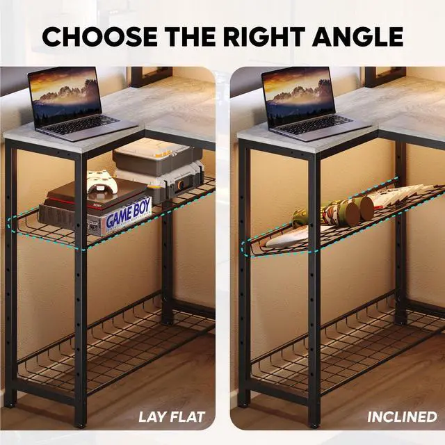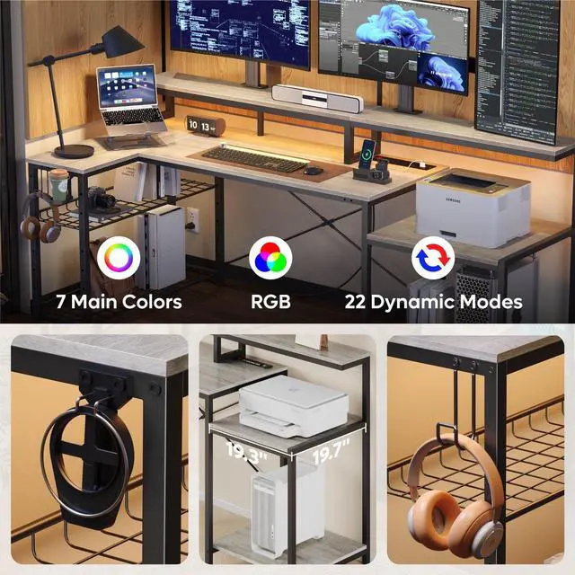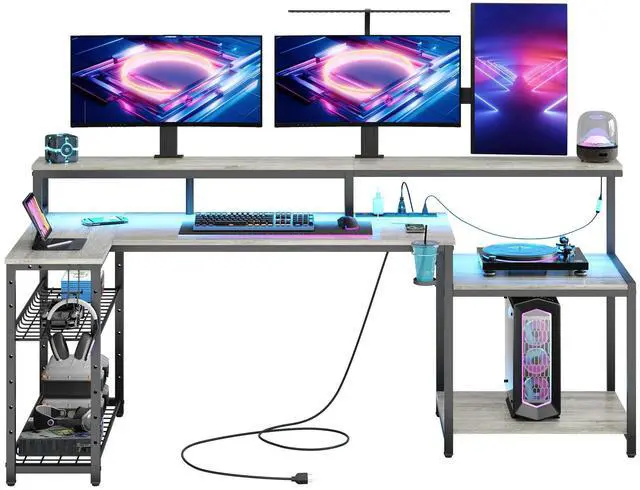 Immerse yourself in the ultimate gaming experience with this L-shaped computer desk complete with a handy monitor stand that stretches 71.5" wide. Equipped with four sockets and two USB ports, it can power up to six devices simultaneously. It features a sleek iron base that helps support the engineered wood desktop, side storage racks, and shelves. A foldable cup holder and a headphone hook also come with this desk, so your accessories are easy to use whenever you need them. And, last but not least, an LED strip underneath the monitor stand provides illumination for your main workspace.