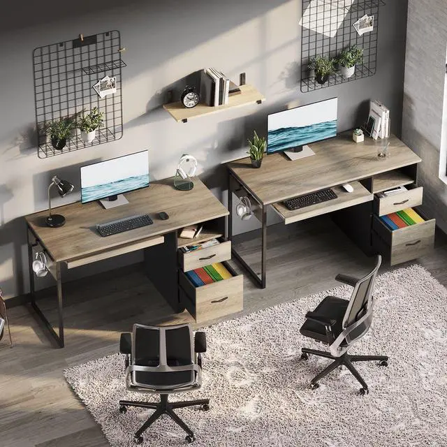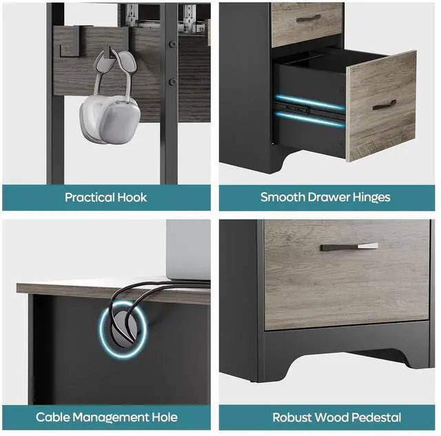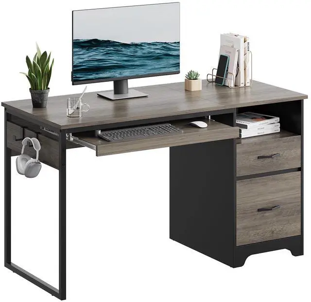 Bestier office desk crafted from premium CARB P2 board, with a desktop supporting up to 150 lbs. This sturdy computer desk features a solid base and metal supports for enhanced stability. Designed for convenience, it includes 2 drawers and a smooth-sliding keyboard tray. The storage drawer holds up to 20 lbs, while the file drawer accommodates up to 40 lbs, fitting Letter/A4/legal files. An open shelf provides easy access to frequently used items, and two side hooks offer storage for headphones and backpacks. The desks waterproof and scratch-resistant surface ensures easy cleaning, while a cable hole keeps the study desk organized.