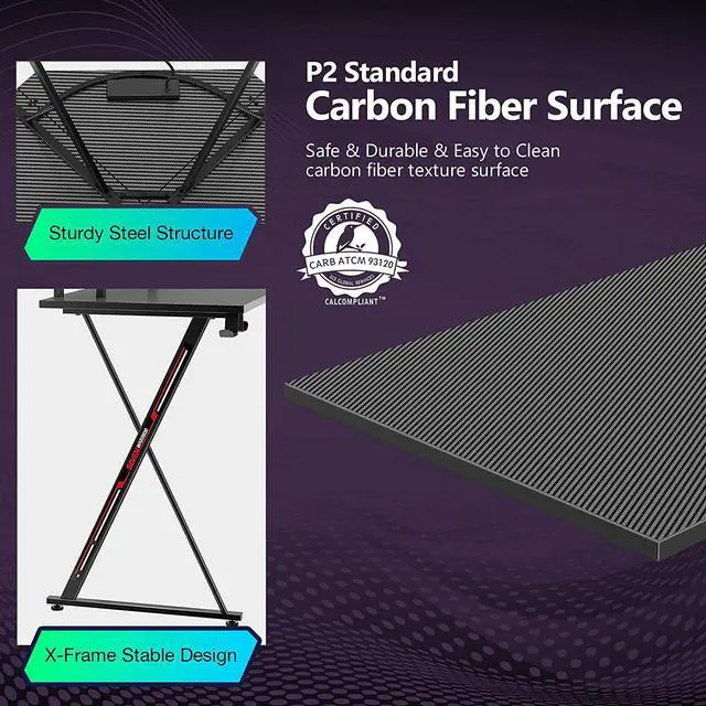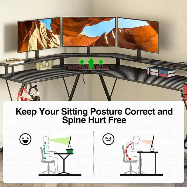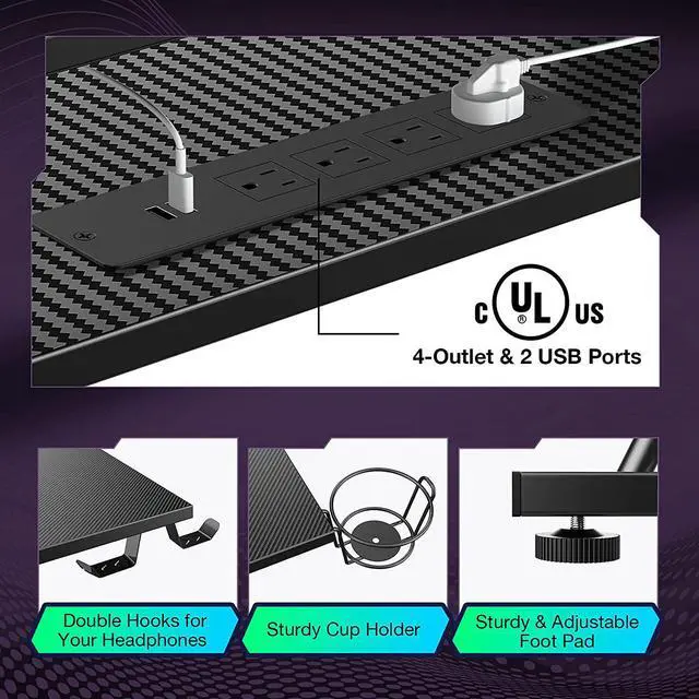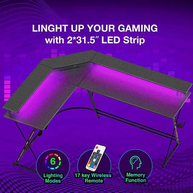 Gaming Desk 58 with LED Strip & Power Outlets, L-Shaped Computer Corner Desk Carbon Fiber Surface with Monitor Stand, Ergonomic Gamer Table with Cup Holder, Headphone Hook, Black