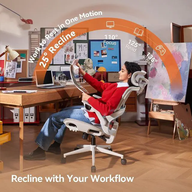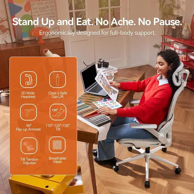 - [Sit Right, All Day Long]: Move, adjust, and settle into comfort that truly fits you. With an adjustable headrest, supportive high backrest, contoured lumbar support, and 2D armrests, every part of this ergonomic office chair adapts to your bodyso you can stay focused, supported, and comfortable, hour after hour.