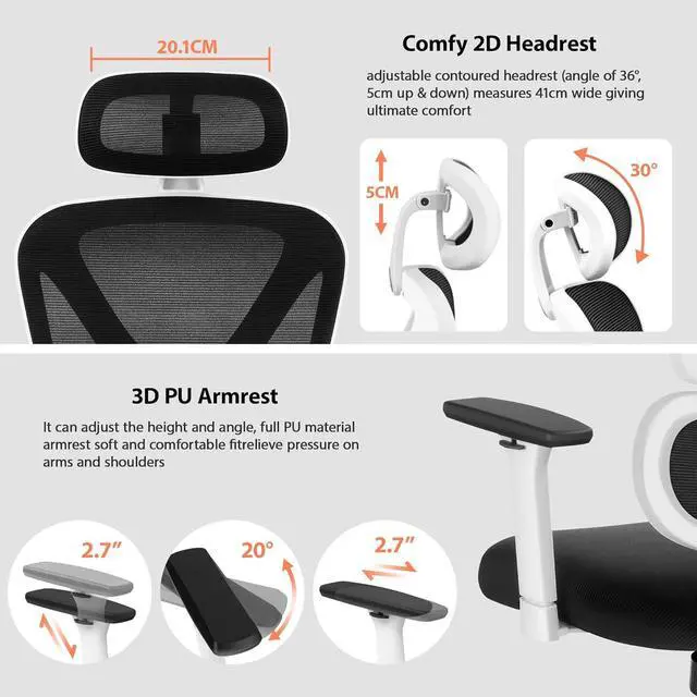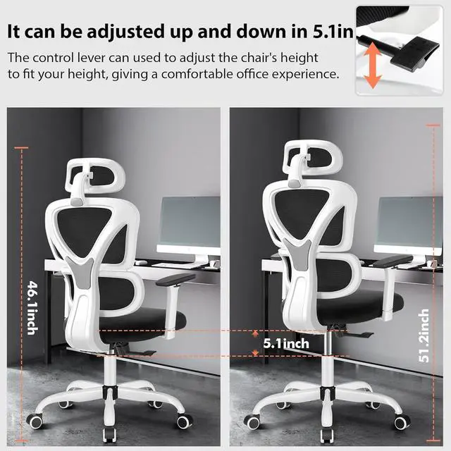 [High Headrest Design] The fixed headrest is upgraded to a lifting headrest, which can be matched with different heights and sitting positions by adjusting up and down. Effectively fit and support the head and neck, and relieve the pressure of sedentary neck. It can eliminate the fatigue of working for a long time and make work easier.
