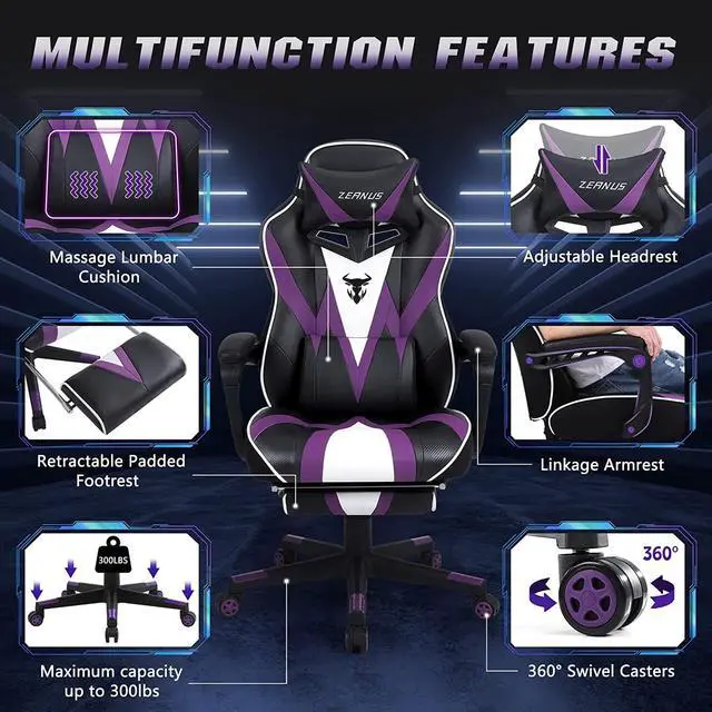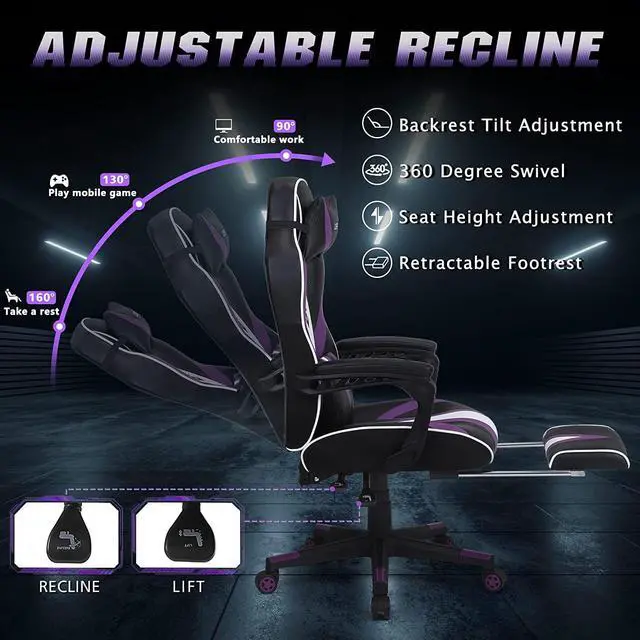 High-Quality of High Back Gaming Chair: Thick padded of high back covered by the great quality PU leather. Adjustable massage lumbar support and headrest pillows protecting your back and neck. High back gaming chair provides you the best break taking experience on the soft footrest when you extended to your legs. Heavy-duty nylon base with smooth-rolling casters enable this chair to 360 degrees of swivel and freely move in your space.