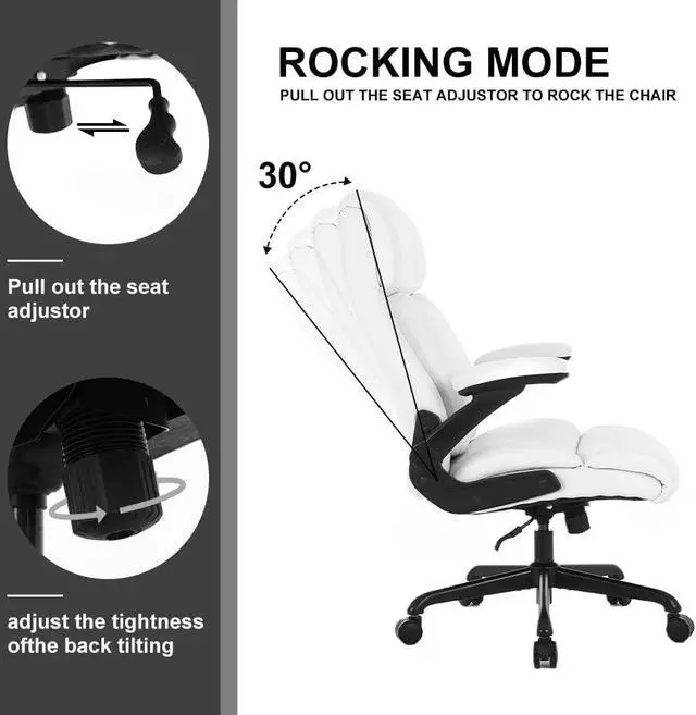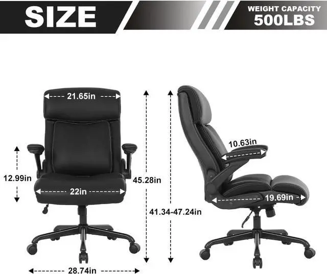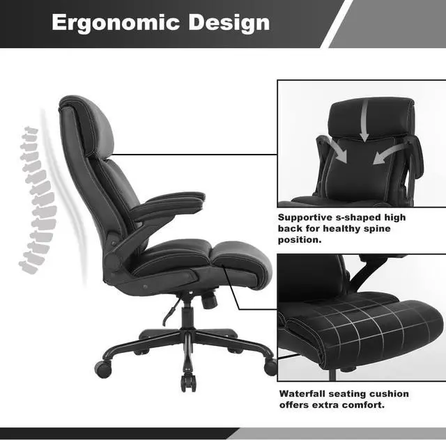 FLIP-UP ARMREST DESIGN: The big and tall office chair with adjustable arms design, to maximize the utilization of your office space, when you do not need to use the executive chair, you can lift the seat armrest upward, so that the office chair adjustable arms can be placed under the desk to save space, while our padded armrests can help you relax your arms when you need to rest.