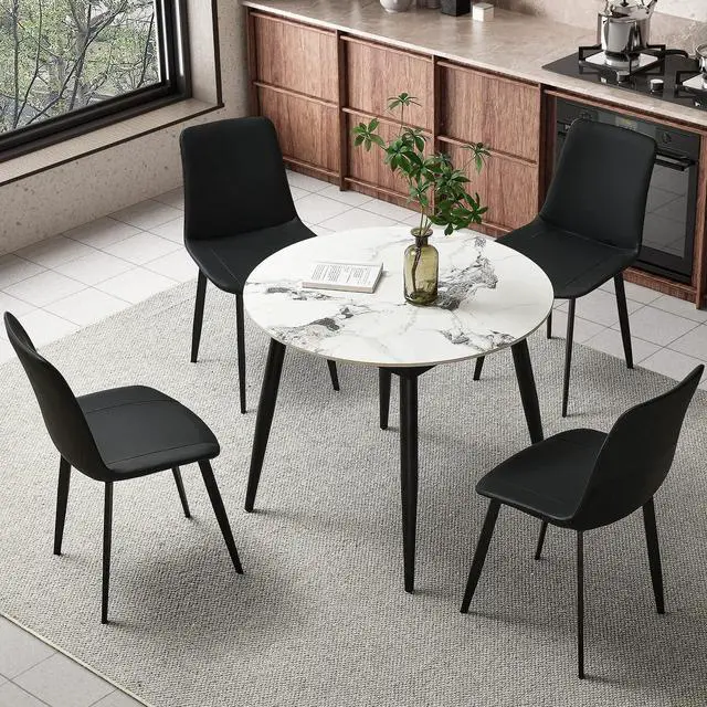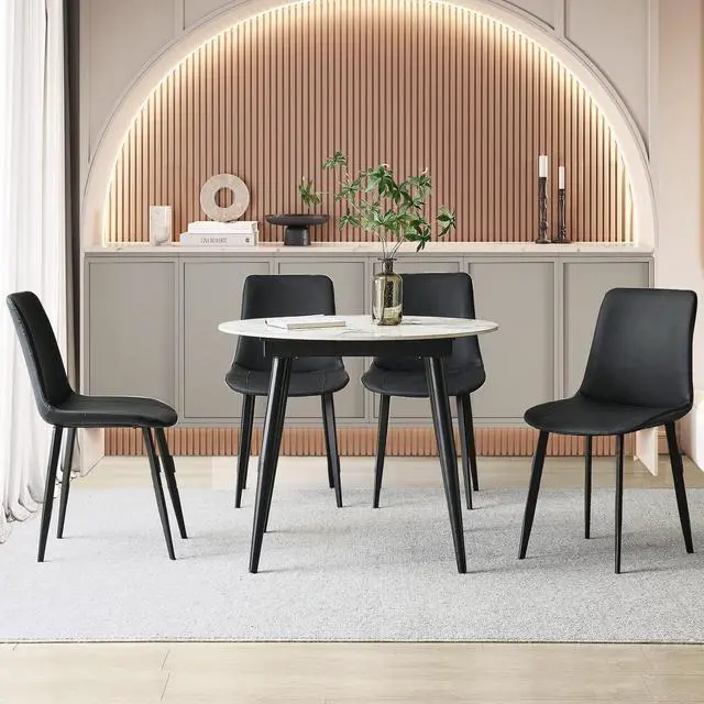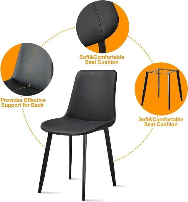 MODERN DINING CHAIRSThese Mid Century Modern black dining room chairs consist of exquisite faux leather upholstery and sturdy metal chair legs. It will be an indispensable part of relaxation in your life. Enjoy your meal time. With these comfortable leather dining chairs, mealtime becomes more fun!