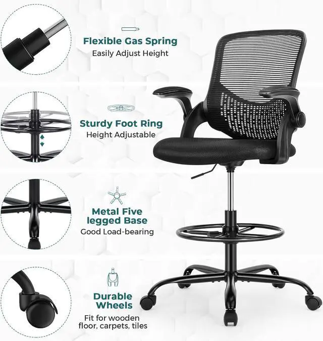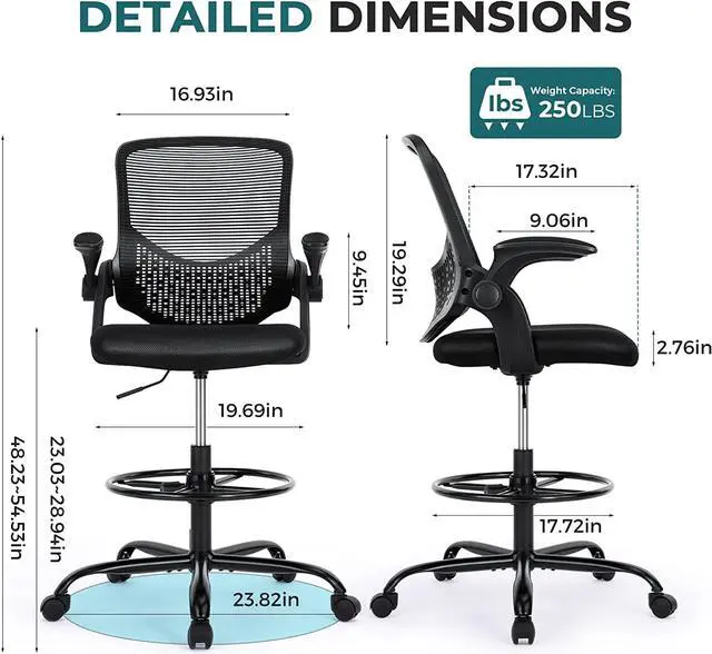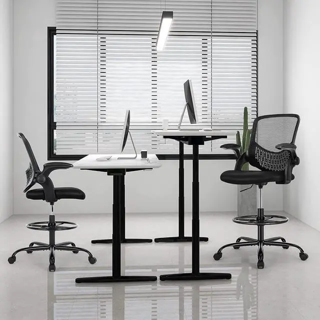 ADJUSTABLE FOOTREST - Designed a height adjustable footrest ring, this standing desk chair adapt to drafting desks, standing desks. The footrest ring of this tall chair provides support to relax your legs. Home office chair can also be used for regular desks as the reason why the seat height can be adjusted from 23 inches to 28.9 inches to meet your different needs.