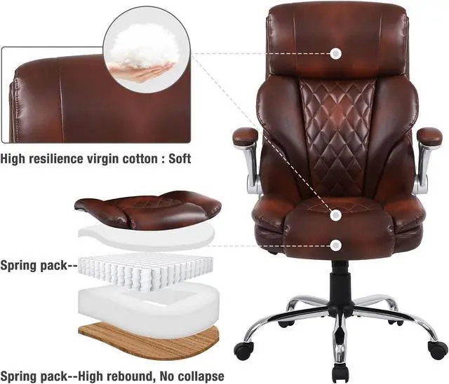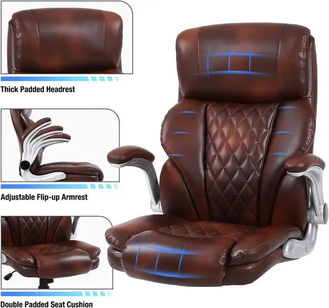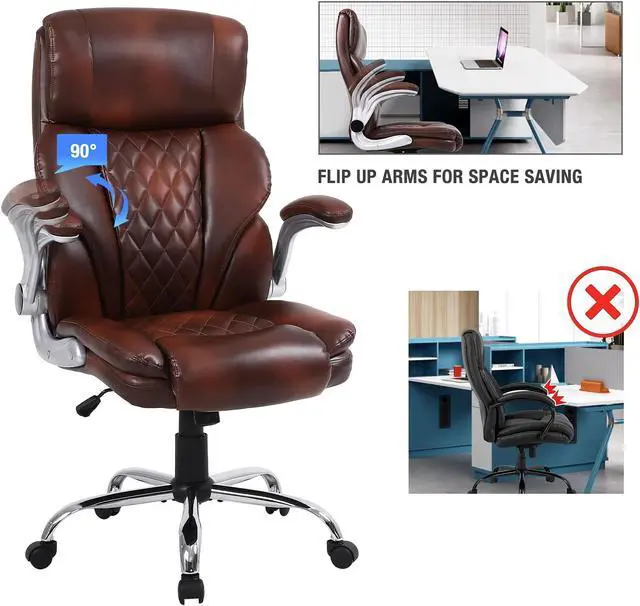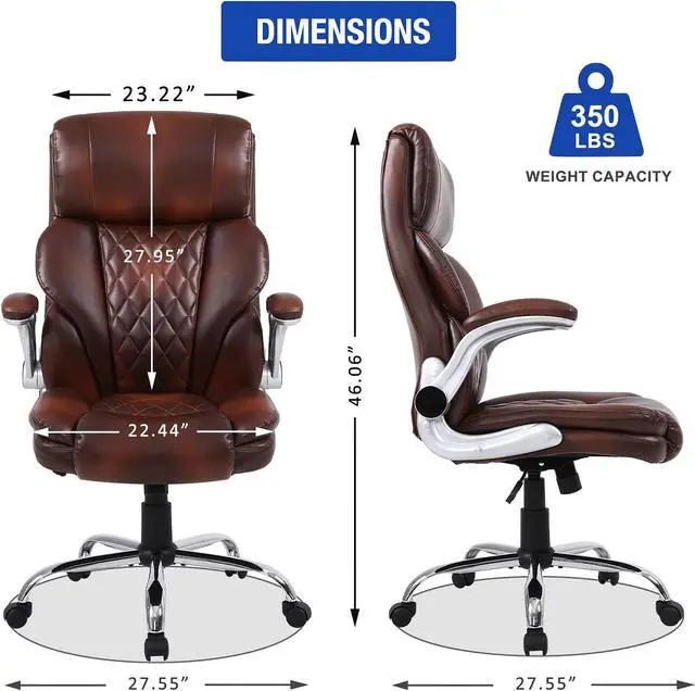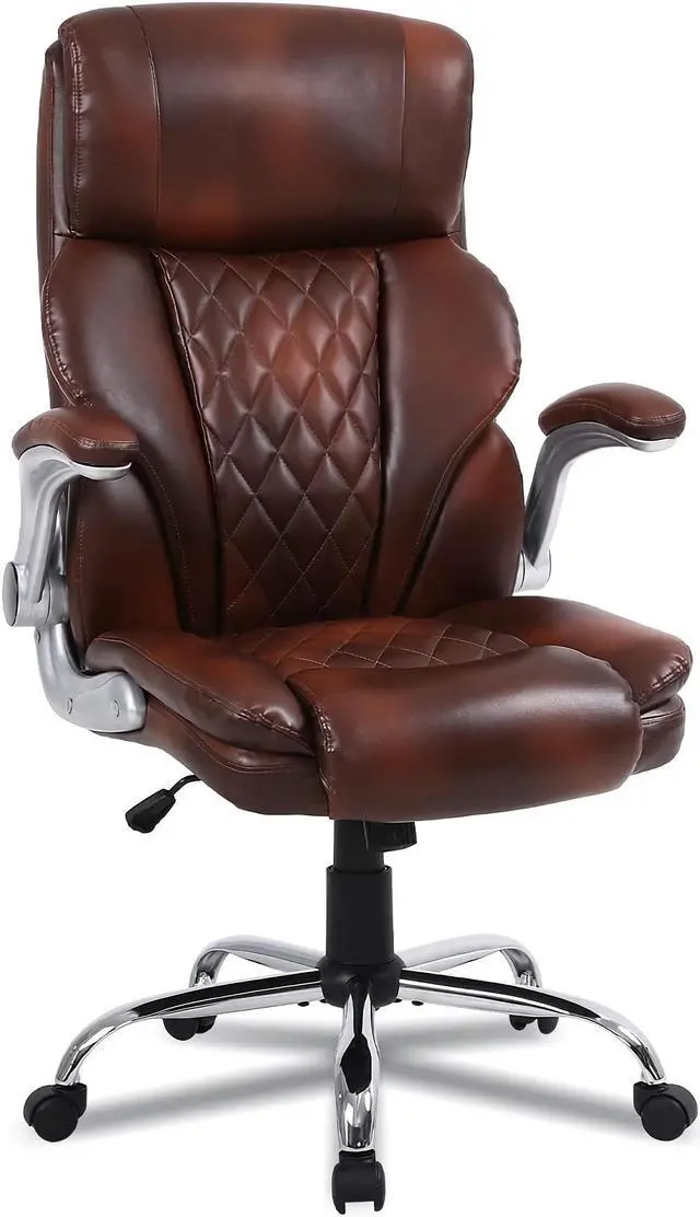 This executive office chair with a high-back features a PU leather exterior to provide a timeless style that fits in any room. Pneumatic, seat height adjustment allows users to sit comfortably at their desks. 360-degree swivel allows effortless rotation for added convenience.