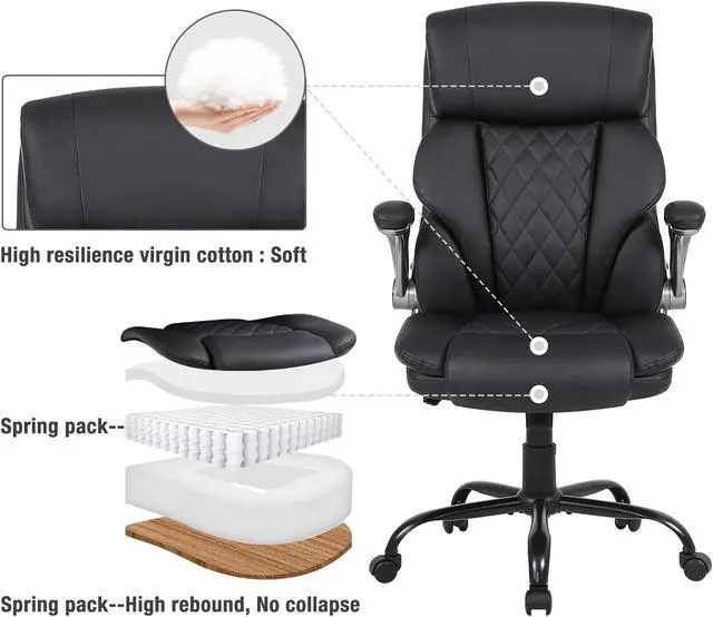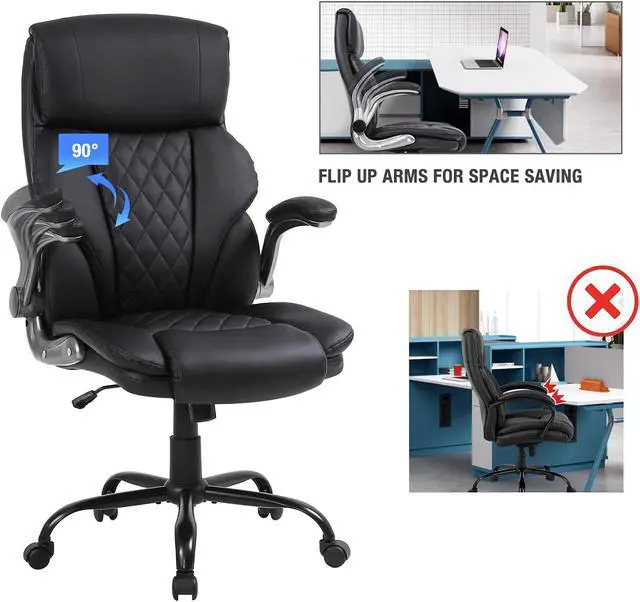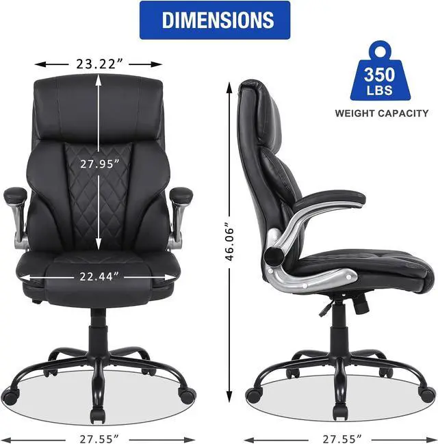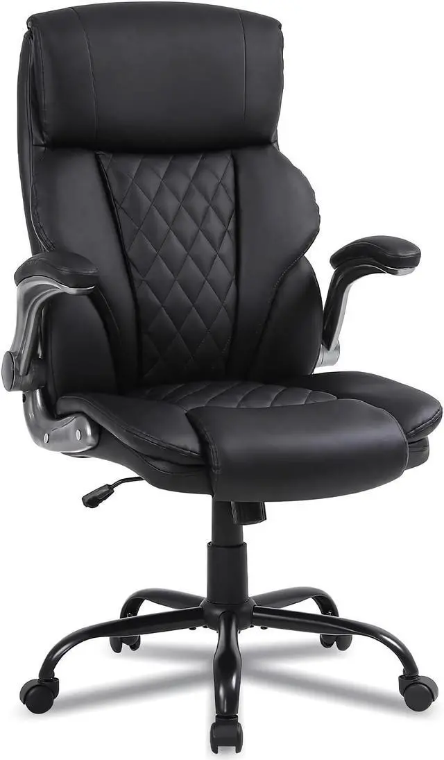 This executive office chair with a high-back features a PU leather exterior to provide a timeless style that fits in any room. Pneumatic, seat height adjustment allows users to sit comfortably at their desks. 360-degree swivel allows effortless rotation for added convenience.