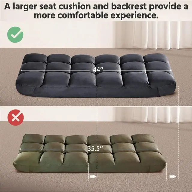 Our DIXSG folding floor chair is built for relaxation and comfort. The seat measures 21 inches (width) x 19 inches (depth) and is padded with 5.5-inch thick foam, bringing you a larger sitting area and a snug reclining experience. To give supreme comfort, this floor chair has 14 gears, which allows you to adjust the backrest from 90 degrees to 180 degrees. Making an adjustment is hassle-free: Place the chair flat on the floor, then lift up the backrest and stop at a suitable position. Built of premium iron, plush fabric and high-density foam, this padded floor chair is sturdy and durable for extended use. With a load capacity of 198 lb, this single floor chair is more comfortable for medium-sized users. Embellished with big biscuit tufting, this folding gaming sofa is great for apartments, dormitories, game rooms, home offices and anywhere else space is limited.