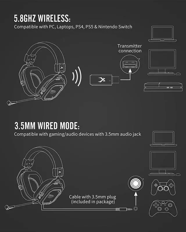 -5.8GHz Wireless Anti-Interference Connection - Wireless Connection with PC PS5, PS4,Mac,Laptop,Wired compatibility via 3.5mm cable with PS5 Controller, PS4 Controller, Xbox Series X Controller, Xbox One Controller and mobile devices. (May require Xbox Wired Adapter for Windows (not included),Best Coexistence with 2.4G & WI-FI & Bluetooth.