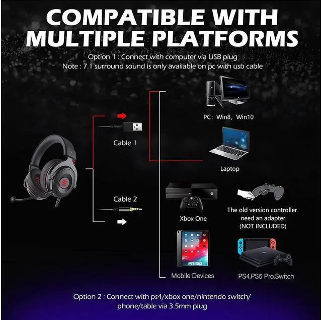 Removable Dual Interfaces Wired Design Both USB and 3.5 mm audio interfaces with two removable audio cords offer several alternatives and diverse sounds. The wired gaming headset is compatible with most mobile devices, PS4/PS5 controller, and