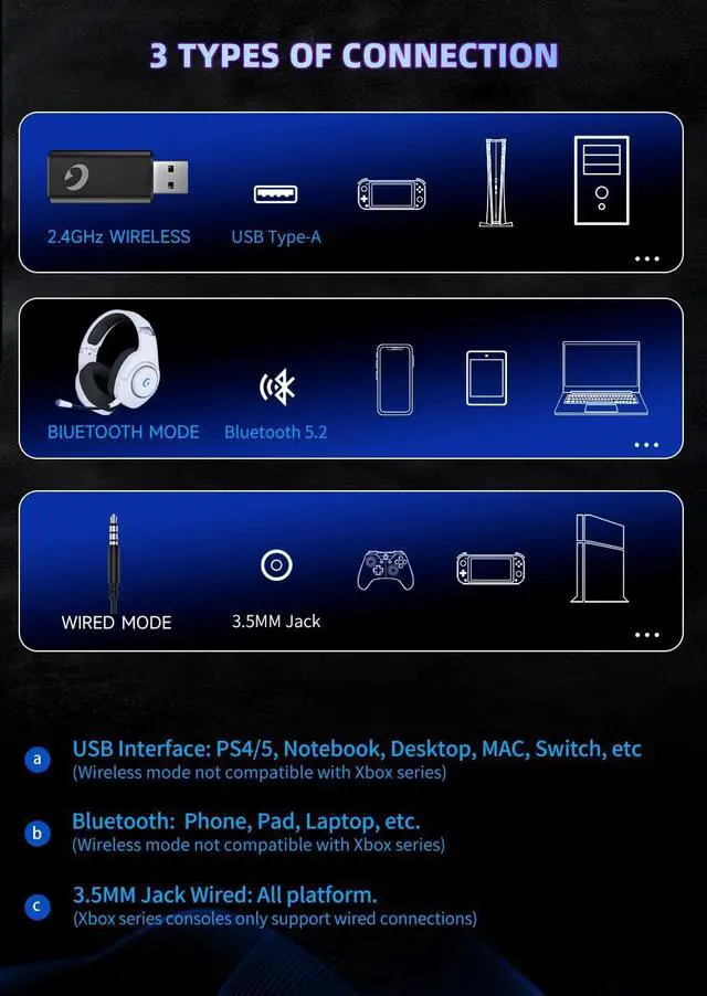 3 Mode Connection & Multi-Device SupportEnjoy seamless connectivity with the PS5 gaming headset via a 2.4GH z receiver, linking to PC/PS4/PS5/Switch and more controllers. Switch to Bluetooth mode with double-click for mobile devices like phones and tablets (and Switch). Use the audio cable to connect to devices with a 3.5 mm socket; Xbox series headsets are compatible (need power-off for wired mode).