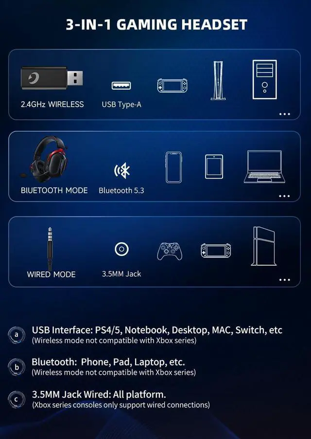 3 Connection Methods & More Device Support 2.4GH z wireless connection support: PS4/5, laptops, desktops, MAC, Switch (due to incompatible host models, peripheral microphones are not available);