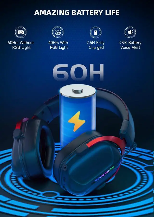 ENC Technology Microphone & Surprising 60H Battery LifeGonbouyuku gaming headphones wireless feature ENC noise reduction microphones for clear communication during team calls. With our advanced battery tech, they offer up to 60 hours of usage when RGB lighting is off, reducing the need for frequent charging and ensuring uninterrupted gaming.