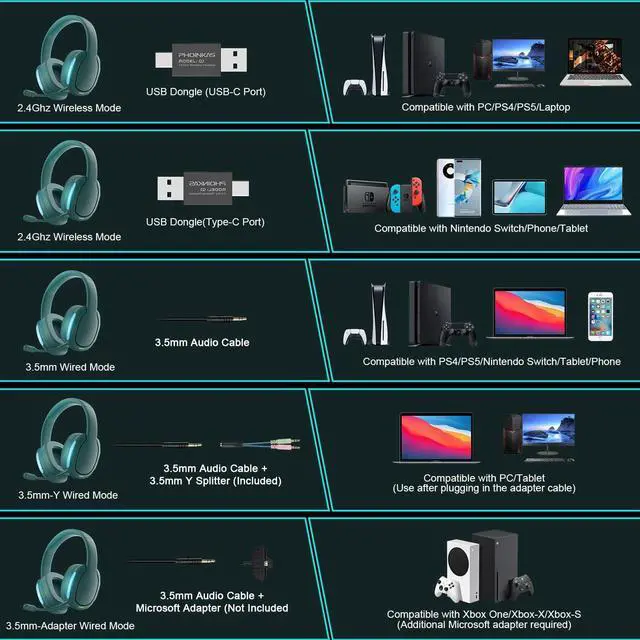 Wired Compatibility: Wired gaming headset connects via 3.5 mm audio cable and is compatible with PC/PS5/PS4/Xbox One (adapter required) /phone/tablet and Nintendo Switch.
