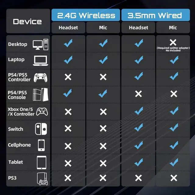 3 Ways to Connection 2.4G hz wireless connection, Bluetooth 5.0 connection and Type C to AUX Cable Wired Connection. With Multiple Connection, the headset is compatible with most devices on market, such as PS4, PS5, Xbox One, Xbox Series S/X, Controller, Switch, PCs, phones, laptops, etc.