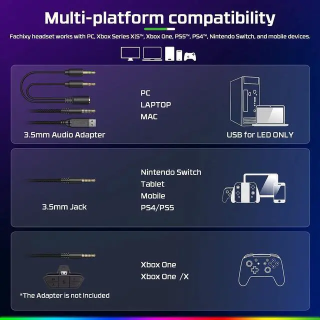 Soft RGB LightingFachixy gaming headset with microphone features a cool RGB light strip design. When connected to a USB port, the LED lighting effects dynamically change to match your game. Reveal your LED RGB fantasies with vibrant, eye-catching lighting in a dim halo. Stylish and charming soft RGB lighting is perfect for video recording and live streaming scenarios.