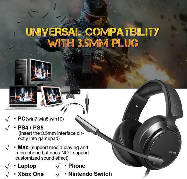 WIDE COMPATIBILITYThe gaming headset supports PlayStation 4, PS5, Xbox One Controller, PC (Win7, Win8, Win10), Nintendo Switch, Laptop, PSP, Tablet, iPad, Computer, Mac, etc. Please note you need an extra Microsoft Adapter (Not Included) when connect with an old version Xbox One controller that doesnt have 3.5 mm audio input. This headset is suitable for various FPS and Sports games.