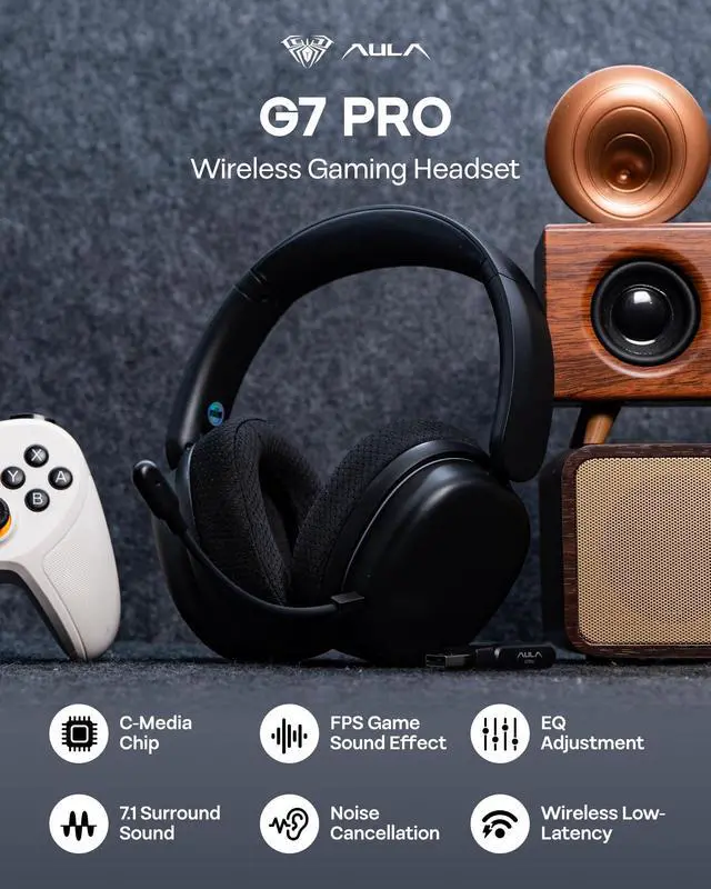 X Aula G7 Pro Wireless Gaming Headset, Dual Mode BT5.3 & 2.4GHz, 7.1 Surround Sound, 80+ Hour Battery, RGB Light, with Noise Canceling Mic for PS5, PS4, Switch, PC (Black)