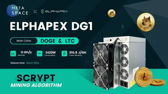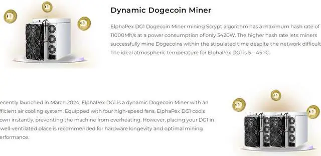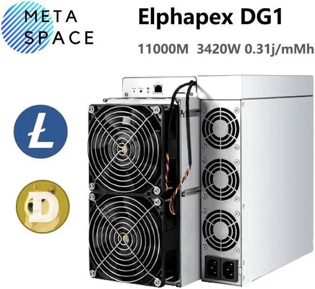 Model Air-Cooling Miner DG 1 from Elphapex mining Scrypt algorithm with a maximum hashrate of 11000Mh/S for a power consumption of 3420W.