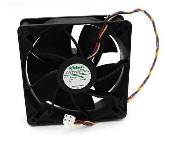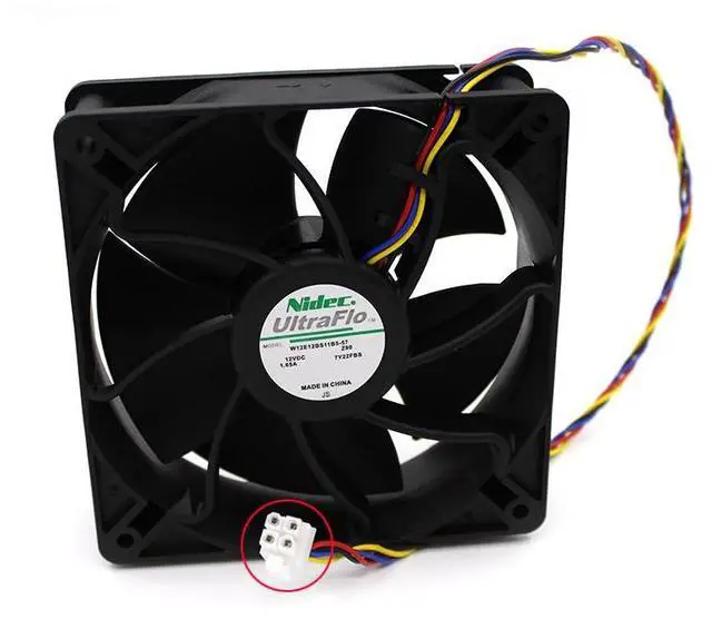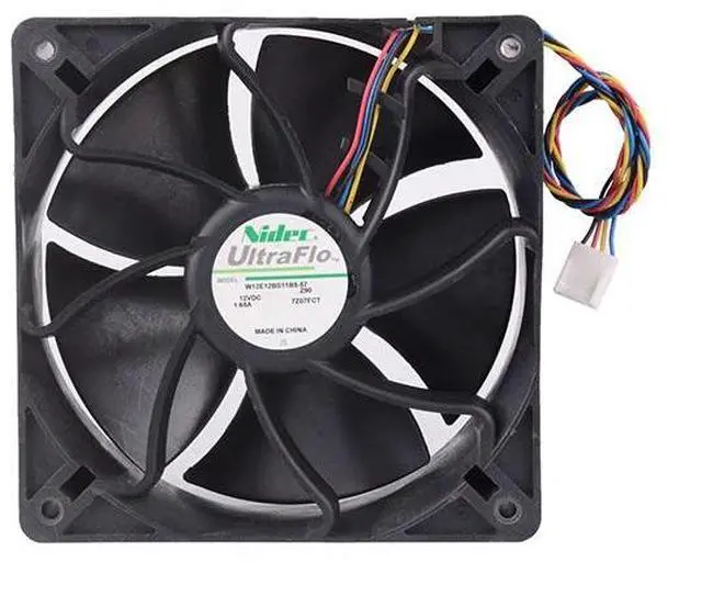 Brand new and original W12E12BS11B5-57 12VDC 1.65A cooling fan, suitable for Antminer S21, T21, KA3, L7, S9, D7, 19 series, 17 series, and the latest model 4Pin fan miner. The fan size is 120mm x 120mm x 38mm. The all-copper motor adopts double ball bearings, has strong wind power and ultra-low noise, and provides stable heat dissipation for miner operation.
