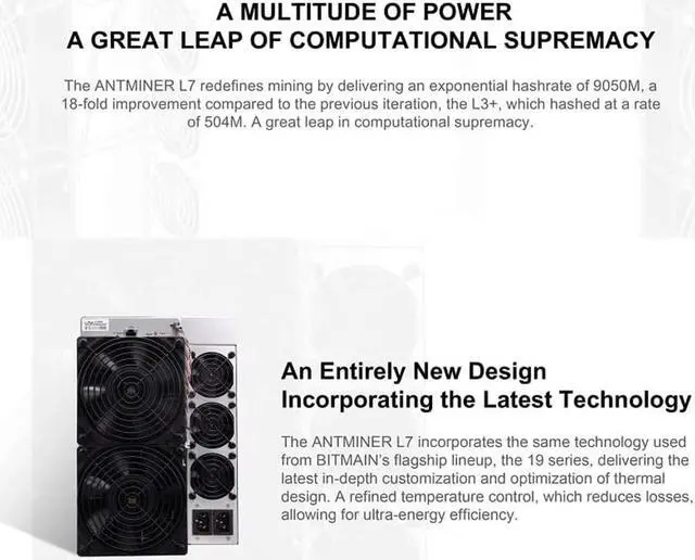 Model Antminer L7 9300M from Bitmain mining Scrypt algorithm with a maximum hashrate of 9.3G h/s for a power consumption of 3425W.