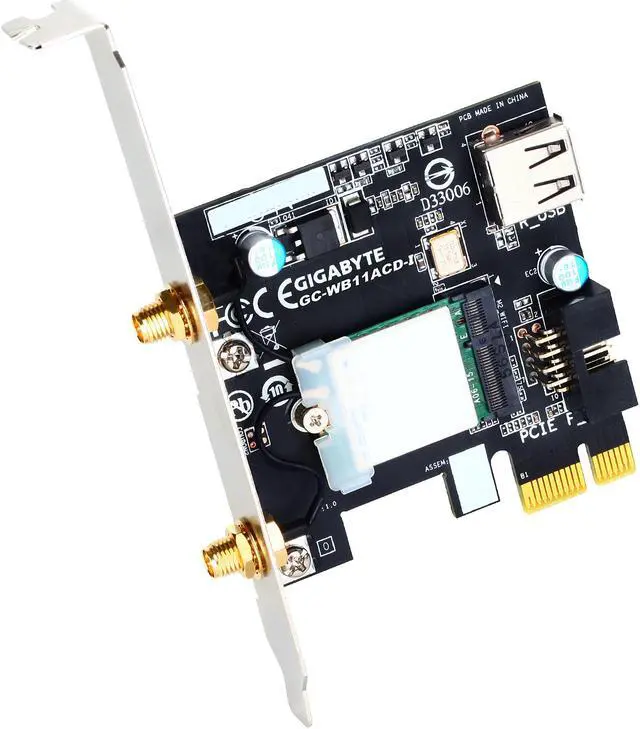 | Specifications | 1x1 802.11ac Dual Band Wi-Fi + BLUETOOTH 4.2 card GC-WB11ACD-I is an exclusive PCIe expansion card that offers support for 1x1 802.11ac Dual Band Wi-Fi and BLUETOOTH 4.2 connectivity More Speed Better Coverage Larger Capacity 802.11ac, Dual Band, 80MHz, 1x1