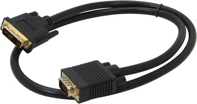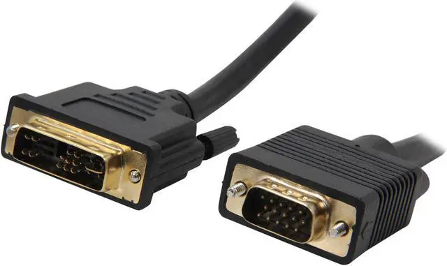 | Features | Connectors: DVI-A 17-pin Male to HD15 Male Connects a VGA port on a computer to a monitor with a DVI-I connector Three 30 AWG analog coaxial lines allow for high speed analog transmission Each coax line is individually wrapped in foam-polyolefin insulation and overwrapped with a braided tinned copper shield 28 AWG copper conductors are individually insulated in hard-density polypropylene to minimize crosstalk, ensuring high-speed, error-free transmission Shielded undermold protects against unwanted EMI/RFI interference Gold-plated contacts provide full conductivity with no data loss Supports hot plugging of DVI display devices PC and Mac compatible Supports analog signal only Compatible with Flat Panel Displays, CRT Displays, Projectors Meets DVI DDWG Standard |