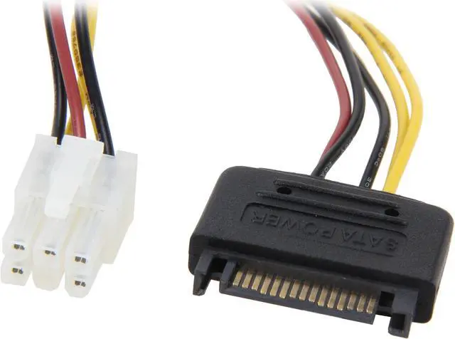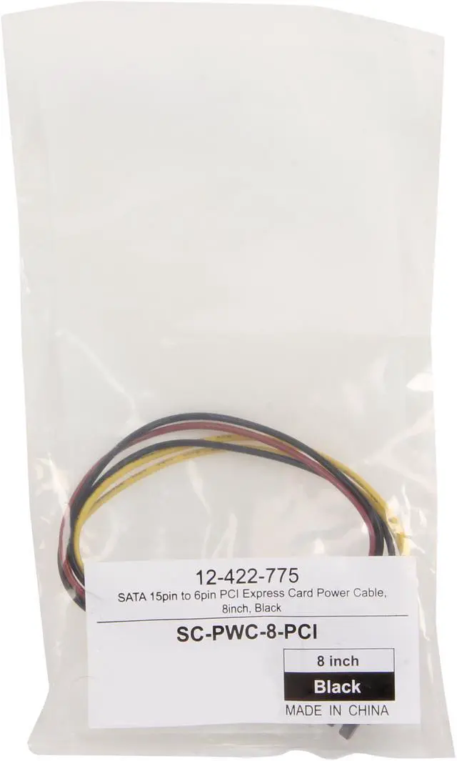 Convert a 15-pin SATA power supply connector to a 6-pin PCI Express video card power connector. The Coboc SC-PWC-8-PCI features a male 15-pin SATA power connector at one end, and a female 6-pin PCI Express power connector at the other end. It provides a cost-effective way to connect a PCI Express video card with an available 6-pin PCI Express connector to a Serial ATA power connector provided by the computer power supply. So you don’t need to upgrade the power supply to be compatible with your new video card. It is 8 inches long.