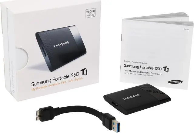 | Features | Hi-speed Performance Don't wait for your data. Compared to traditional spinning platter external HDDs, the T1's portable SSD is up to 3-4 times faster. This means you'll save time when moving or retrieving files like music, movies, documents and photos. Cutting Edge Security For many people their data is their life - whether it's personal or professional. That's why we've made sure the T1 is embedded with the latest in advanced security using an AES 256 bit encryption algorithm to secure valuable data. No installation is required and all your data can be accessed with one password. Sleek, Stylish Design Let your portable SSD be an expression of your tech-savvy style. The T1's sleek premium design is accentuated by its slim compact shape, combining style and portability. Plus, it features laser patterning and black chrome metalized finishing. Internal SSD-level Performance Now you can get the responsiveness of an internal SSD in a compact portable package. External HDDs can't compare with the T1's random read and write speeds which provide off-the-charts performance when accessing your files. Compact & Convenient You deserve immediate access to your data any time you want it. Now, you can keep your data with you at all times thanks to the T1's compact, portable design. Just slide it into your pocket, wallet or bag and you're good to go. Data storage has never been so portable. Shock & Vibration Resistant Because it utilizes solid state technology, the sturdy T1 has no moving parts, making it more resistant to shock and vibration. It also features Dynamic Thermal Guard which protects data in high temperatures and allows you to take your data safely with you wherever you go. |