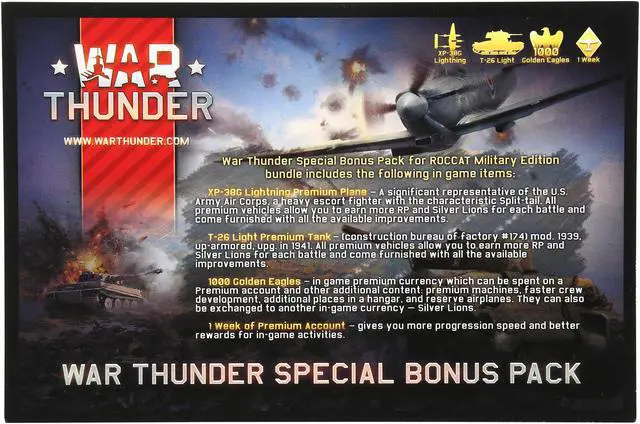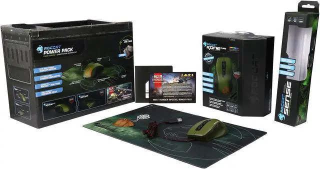 Unleash your full gaming power with the ROCCAT ROC-16-225 Military Power Pack that includes a ROCCAT Kone Pure gaming mouse and a Sense mouse mat, both in camouflage finish, as well as having an authentic ROCCAT dog tags and a bonus War Thunder premium pack.