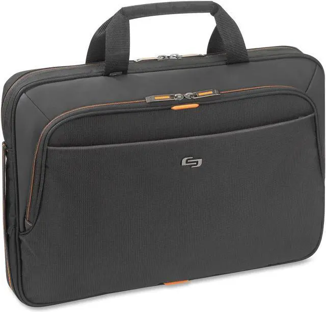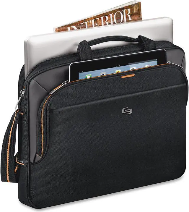 Slim Laptop Brief offers a padded compartment that protects laptops up to 15.6", dedicated interior pocket for iPad, tablet or eReader. Includes a front Velcro pocket and a front zip-down organizer section. Padded carry handles, adjustable shoulder strap and rear ride along strap for consolidated travel make for easy mobility.