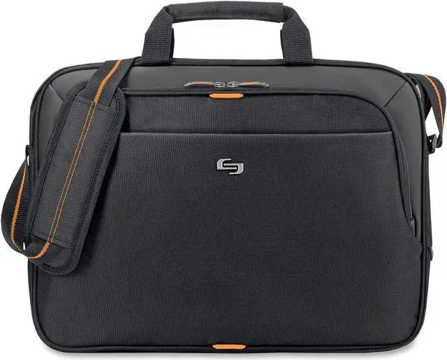 Fully padded 15.6" laptop compartment. Internal iPad®/tablet pocket. Full length front zippered pocket. Full size front zip-down organizer section. Orange interior lining. Vinyl body. Adjustable shoulder strap. Back strap slides over luggage handle.