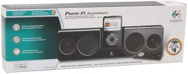 Logitech's StereoXL technology coordinates a pair of 2" high-excursion speakers and a pair of 3" pressure drivers to produce a deep, full-spectrum sound field you simply must hear to believe. When you're ready to go out, the included travel case protects the speakers, remote, and slimline AC adaptor, with enough space left over for your nano. Whether you're headed for a vacation, off to work, or moving to the dorms, you'll be glad you have the Pure-Fi Anywhere speakers along!