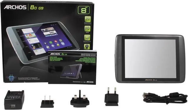 | Other Features | Video playback - MPEG-4 HD (up to 1080p) - MPEG-4 (ASP@L5 AVI, up to DVD resolution) - H.264 HD (HP@L4.2, up to 1080p@30 fps and 1080i/720p@60 fps) - With optional plug-in: Cinema: MPEG2 HD (up to DVD resolution MP/D1) With the above codecs, the device can play video files with the following extensions: AVI, MP4, MOV, 3GP, MPG, PS, TS, VOB, MKV, FLV, RM, RMVB, ASF, WMV Photo viewer: JPEG, BMP, PNG, GIF Subtitles: .srt, .ssa, .smi, .sub formats supported Miscellaneous - Built-in GPS - Built-in speakers - G-sensor - Compass - Built-in kick stand - Built-in Microphone Scalability - Device automatically downloads latest firmware updates when the WiFi connection is activated - Updates can also be downloaded at www.archos.com Minimum system requirements - Microsoft Windows 7, Vista, XP, or higher - Mac OS. X with Transfer Files application (not included) - Linux with android MTP tool (not included) - USB 2.0 interface |