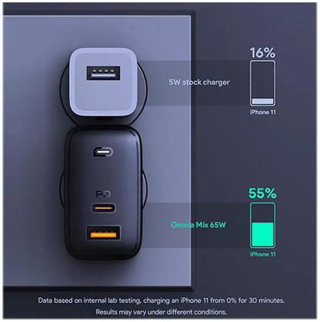 Enhanced by AUKEY OmniaChip, Omnia Mix 65W is 50% smaller and lighter than a 61W MacBook stock charger.