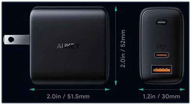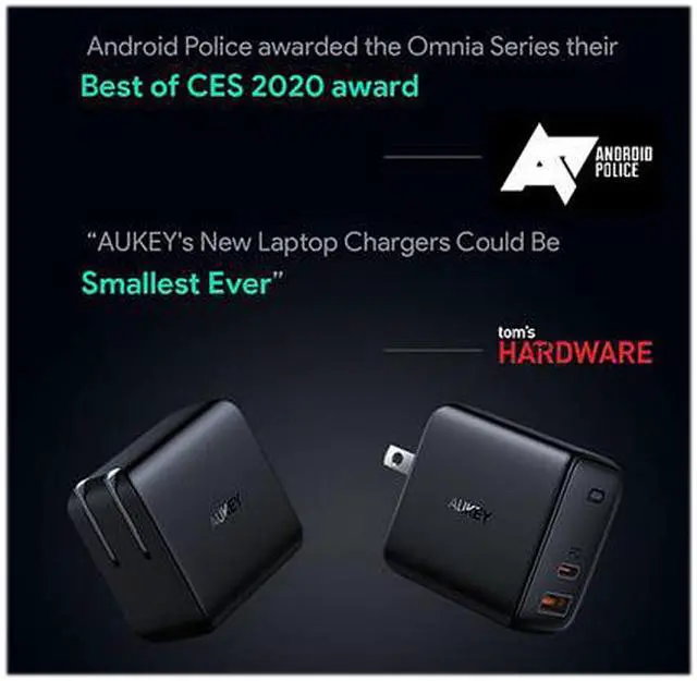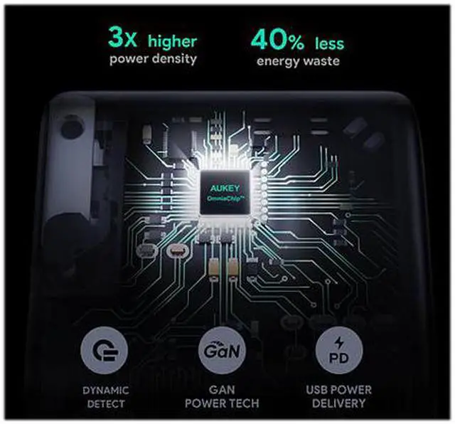 Integrates AUKEY's latest OmniaChip which makes use of gallium nitride (GaN) to pack more power into a smaller and lighter charger.