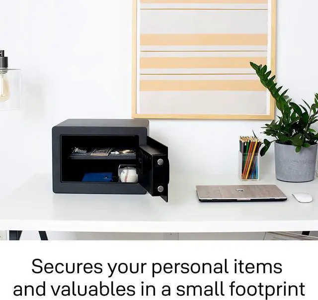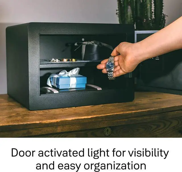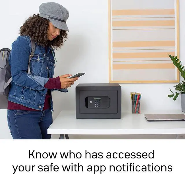 Protect your valuable belongings, like your important documents or jewelry with the Yale Smart Safe. Unlock using the built in keypad, key or the Yale Access App and never get locked out of your safe with battery back-up. With the door activated light and included shelf and hooks, users are easily able to see and organize their most trusted valuables. This safe can be trusted to secure your most valued possessions with its laser cut door and two anti-saw bolts for extra security.