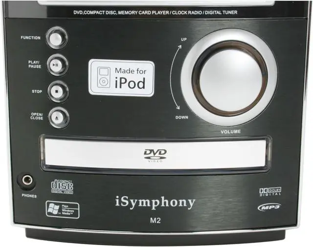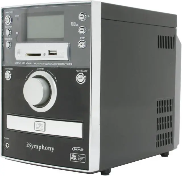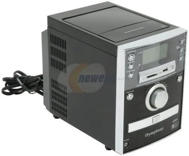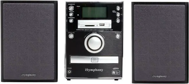 The iSymphony micro music system puts new spin on the old boom box! Whether you're looking for a portable sound system or a room-sized stereo, you'll appreciate the versatility iSymphony offers. Enjoy 50 watts of sound output from your docked iPod, digital music direct from your SD or MMC card, CD or CD-R/RW, or radio anywhere you go. Connect your Shuffle, PSP, or other device using the USB port. With a built-in equalizer and Dynamic Bass Boost, you always get bold sound that's customized for your music.
