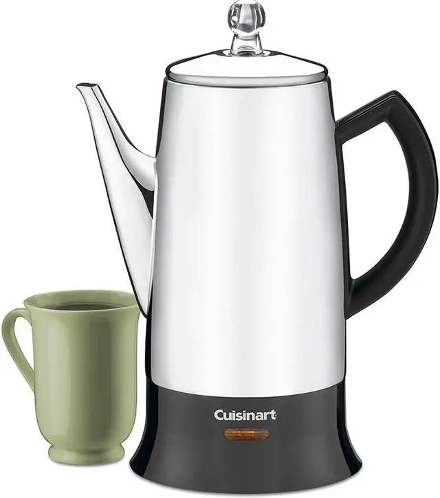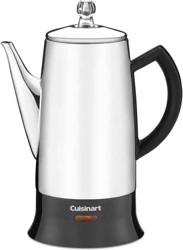 Cuisinart Classic 12-Cup Percolator Convenient capacity of 4 to 12 cups Precision no-drip spout: long, tapered and pours without a spill Stainless steel housing Transparent knob reveals progress of the brew cycle Comfortable handle Stay-cool bottom - sits safely on any surface without scarring Ready indicator light shows when coffee is ready to pour and enjoy Detachable cord.