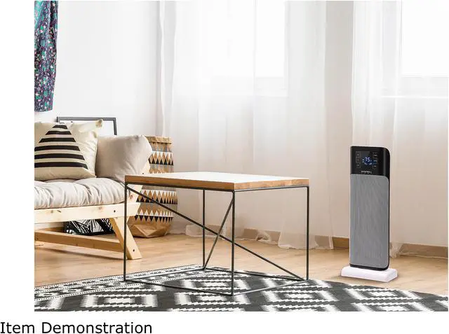 A sleek and stylish digital ceramic tower heater equipped with a cooling fan, remote control and much more.