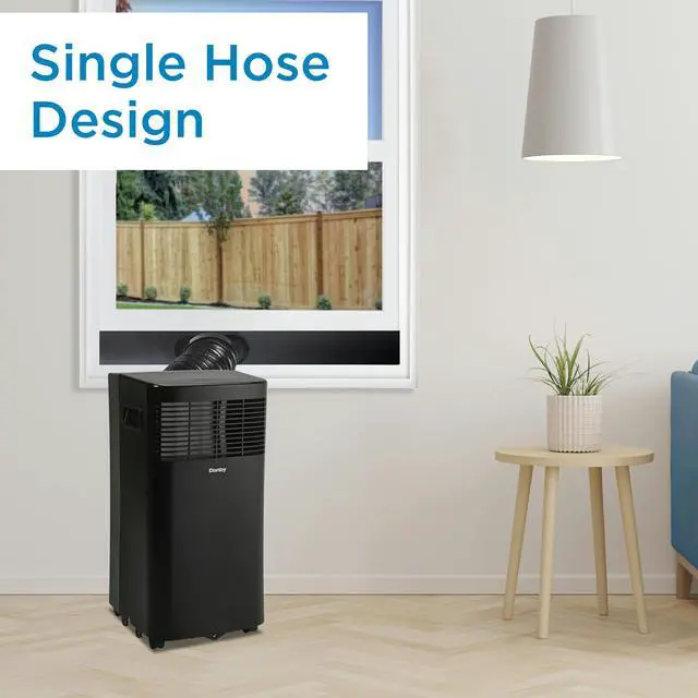 Single hose design efficiently exhausts warm and humid air outside.