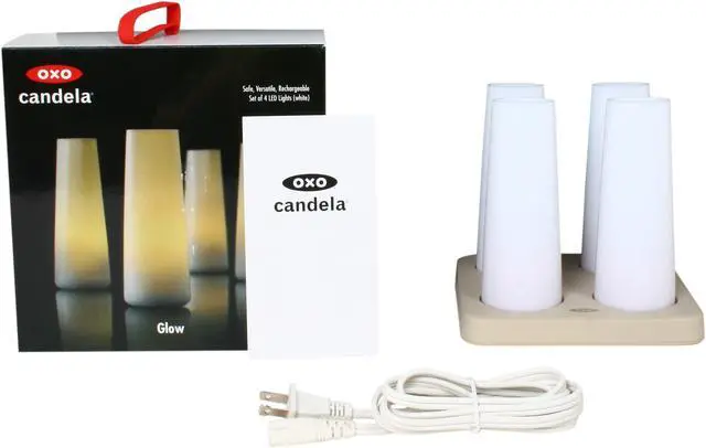 Light the night with OXO Candela Glow rechargeable lights. These warm, ambient LED lights can be left unattended and won’t blow out in the wind. With 8 hours of run time, these versatile lights create ambiance on the dinner table or bedside, while entertaining or reading alone. Portable and cordless, they are suitable for many uses and occasions. The long-lasting Glow rechargeable LED lights are brighter, safer, cleaner, more durable and easier to use than candles. Pack includes 4 LED lights with rechargeable batteries and charging base.